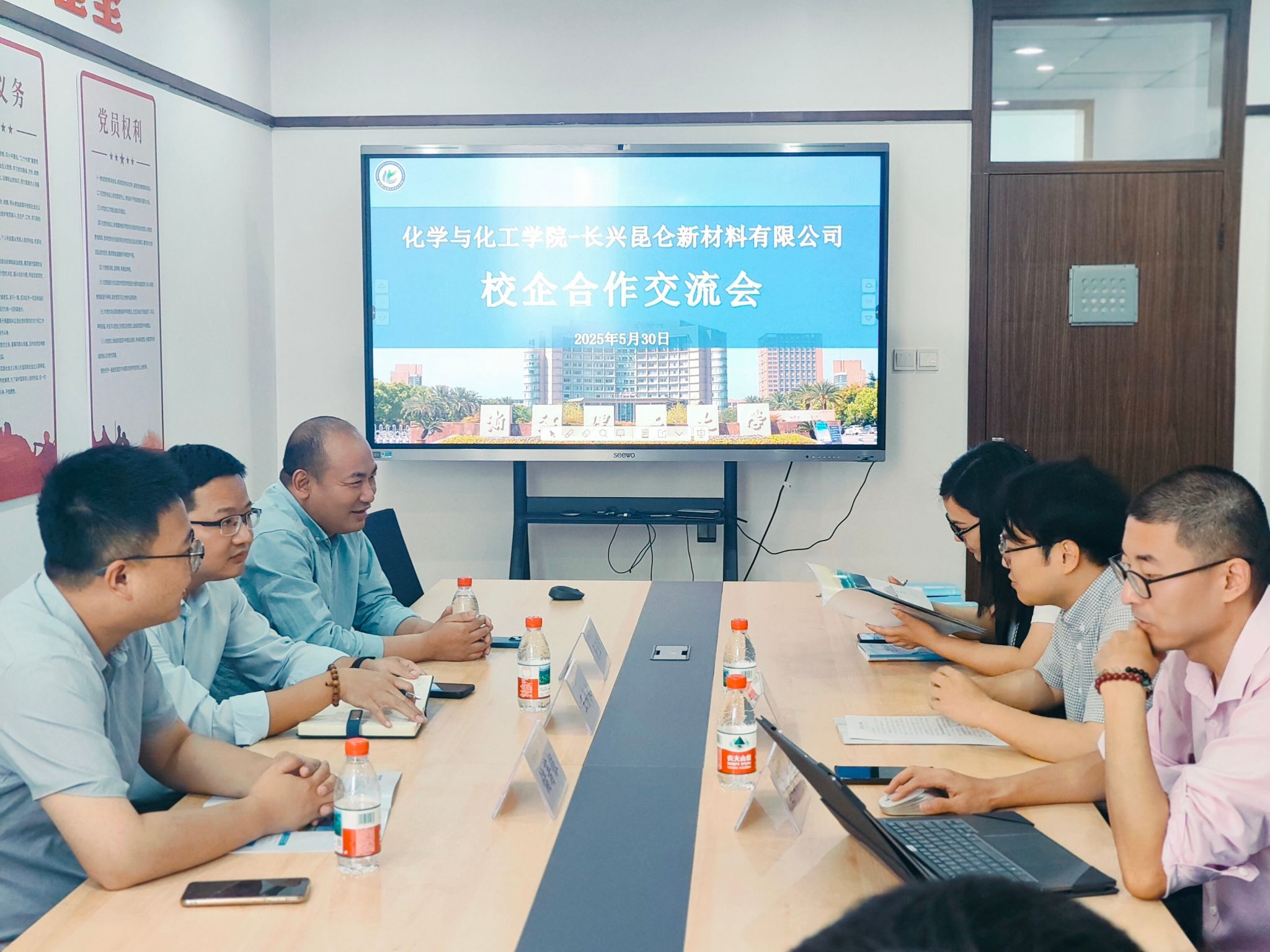 为深入推进校企合作,湖州昆仑亿恩科电池材料有限公司副总经理王传水、人力资源总监杨玉明、招聘经理储著银一行来访化学与化工学院。近日,化学与化工学院党委副书记王勇能、化学系副教授郭云南、学工办主任胡丽、就业辅导员等接待了王传水一行。双方在19号楼522会议室召开座谈,2025届毕业生代表一同参会。