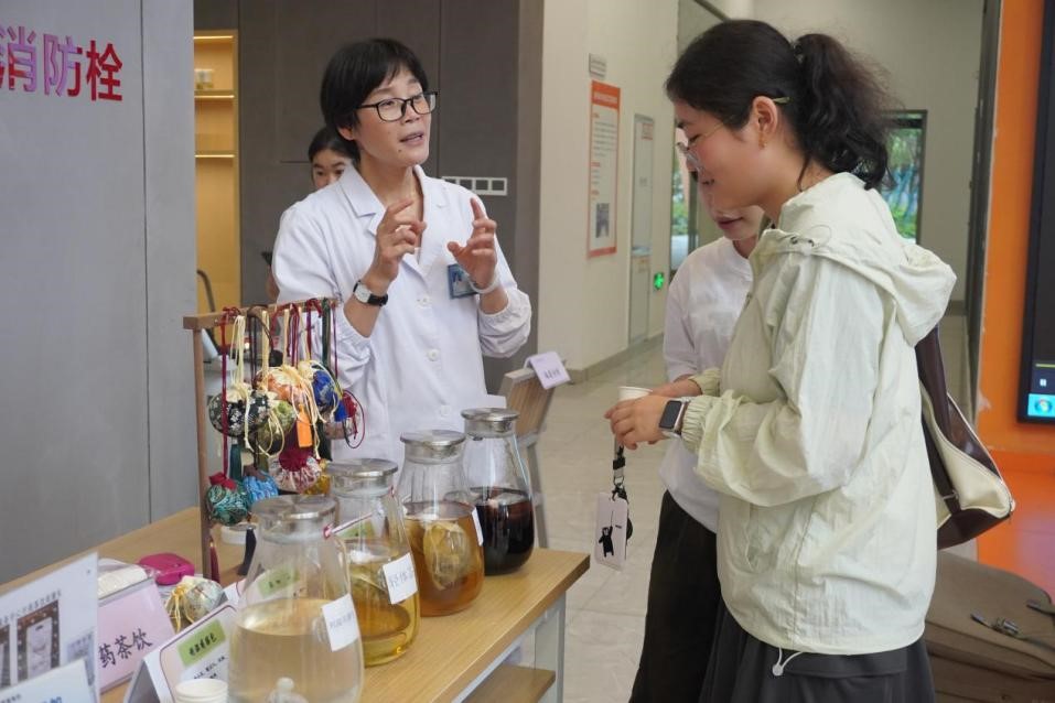 健康服务专区除了延续往年的中医问诊、针灸推拿、AED急救培训等特色项目,今年运河分院党支部特邀来自临平一院医共体党委的党员医生们带来体脂分析和中药茶饮导鉴服务,专业医师们通过细致的健康评估和个性化的养生建议,让师生们在感受中医药文化魅力的同时,更收获了科学实用的健康知识。