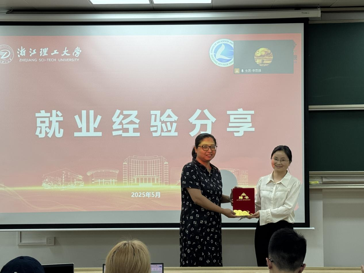 讲座前,学院党委副书记张姗姗为费晶晶颁发聘书,聘请费晶晶担任生命科学与医药学院职业规划校友导师。