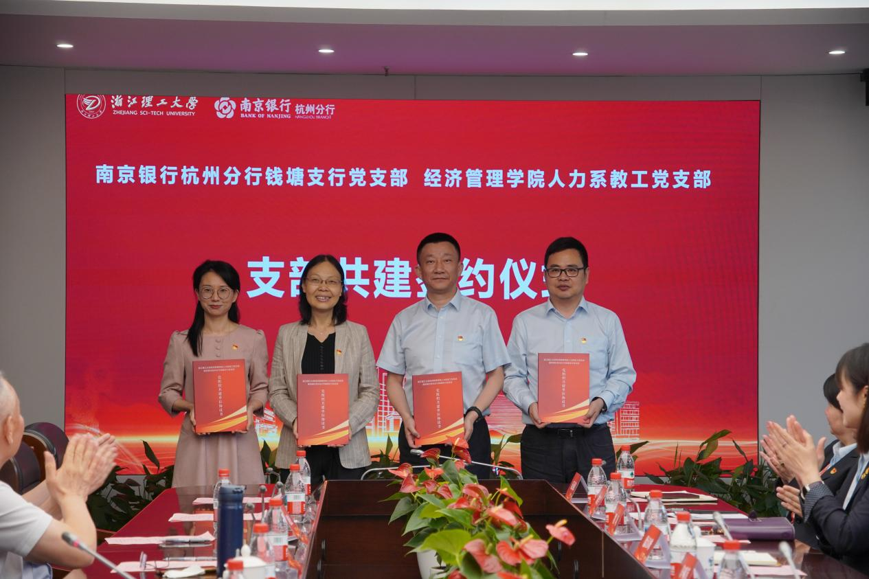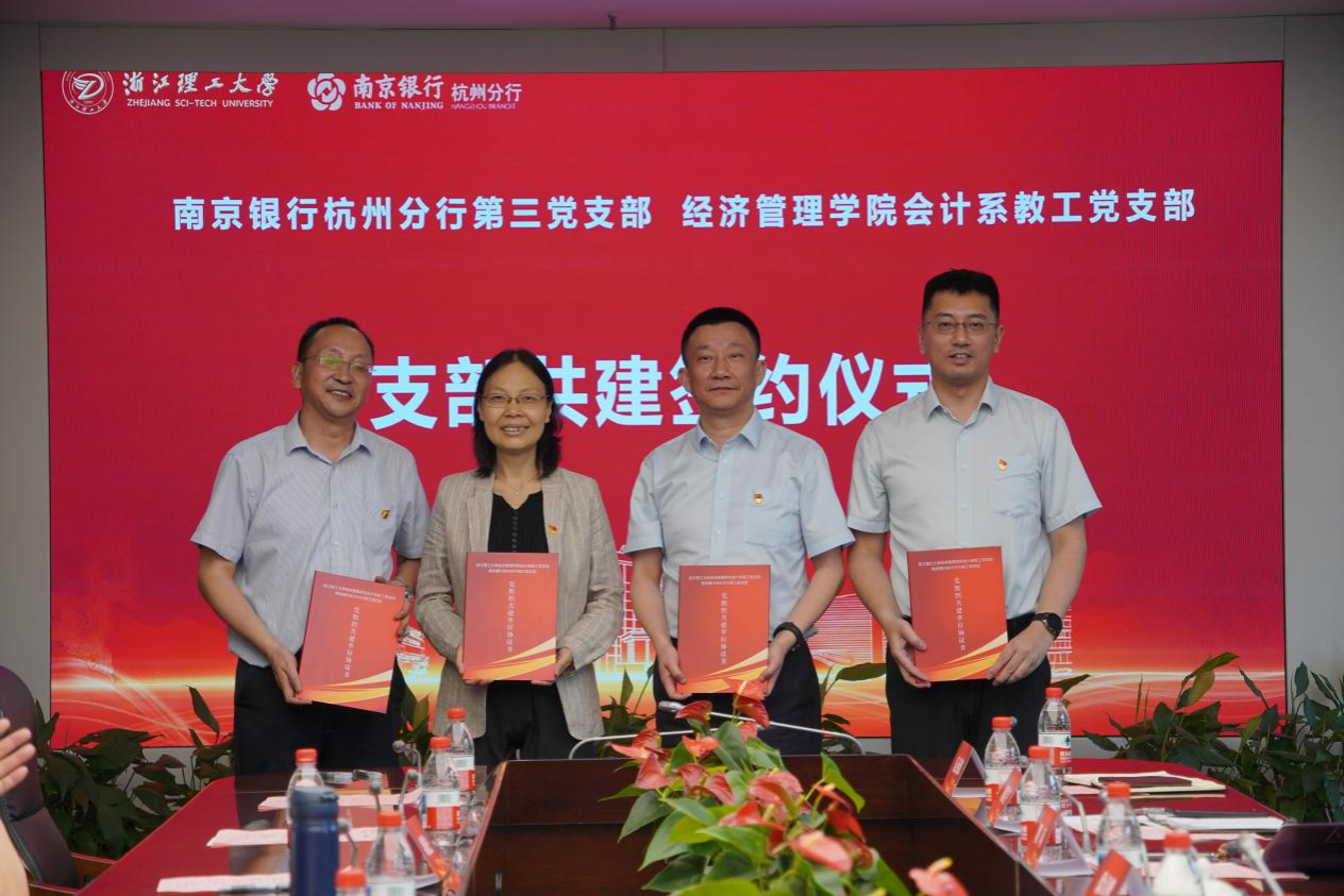 经济管理学院会计系教工党支部与南京银行杭州分行第三党支部、人力系教工党支部与钱塘支行党支部分别进行了党建共建签约仪式。