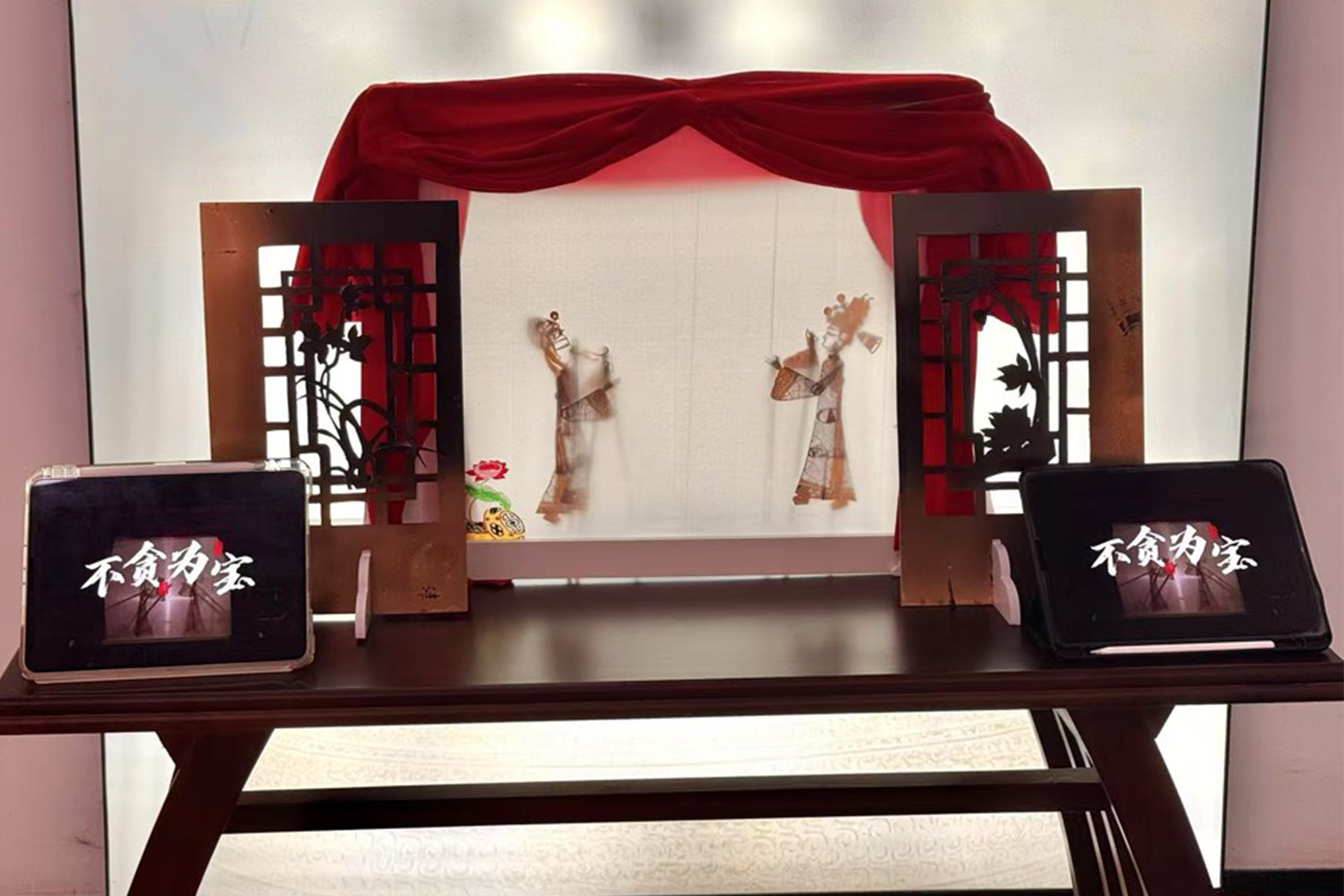 启动仪式后,与会领导与当地群众一起参观了由艺设学院学生创作的清廉装置作品展览。《悬“廉”于心》作品,以钢铁为骨、宣纸为衣,象征廉洁既要有刚正不阿的底气,也要有温润如玉的涵养;皮影戏台装置——《不贪为宝》,通过传统技艺演绎春秋时期子罕拒宝的典故,让历史智慧在光影交错中焕发新生;《蓝滩》则以海滩为灵感,用镜面塑料与多色灯带营造出澄澈的海洋意象,廉洁如海,看似平静却蕴含着抵御污染的强大力量……现场作品通过装置艺术、互动体验与数字展陈的多元融合,共绘廉洁文化传承创新的时代画卷。