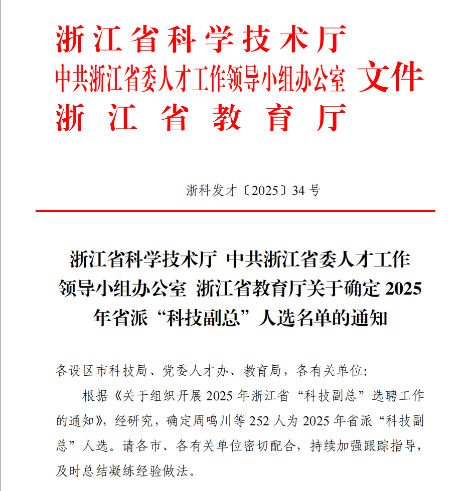 近日,浙江省科学技术厅、中共浙江省委人才工作领导小组办公室、浙江省教育厅发布了《关于确定2025年省派“科技副总”人选名单的通知》(浙科发才〔2025〕34 号),我校20位教师入选省派“科技副总”,在浙江省省属高校中排名第一。
