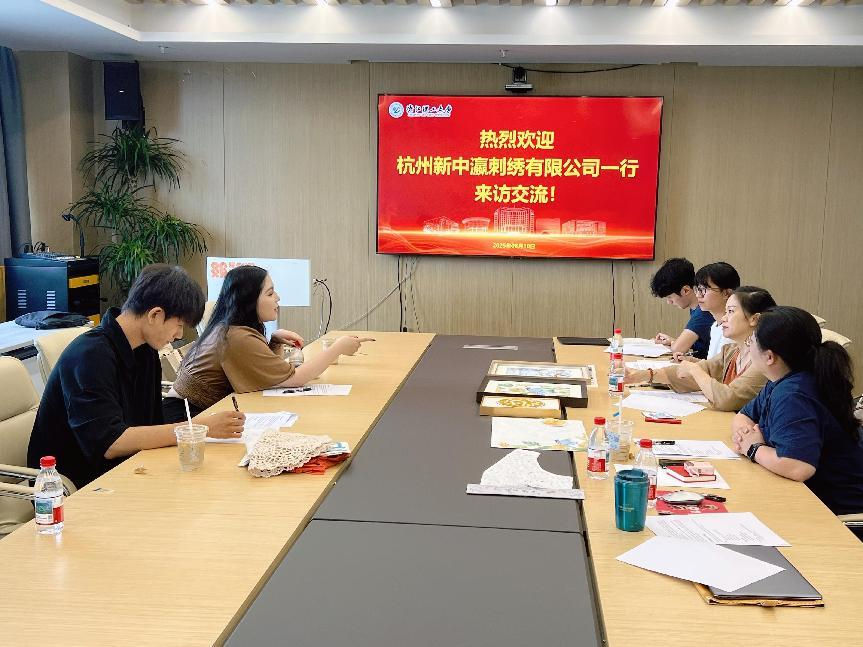 8月10日,新中瀛刺绣副总经理潘翊绮一行回访服装学院,与艺术与科技系教师代表进一步推进产教融合项目。双方围绕中瀛刺绣旗下独立海外品牌PAM PAN的设计需求展开深入研讨,并达成合作意向,未来将共同探索刺绣在现代家居领域的艺术化表达,融合设计美学与刺绣工艺,打造兼具情感张力和视觉节奏的当代产品。