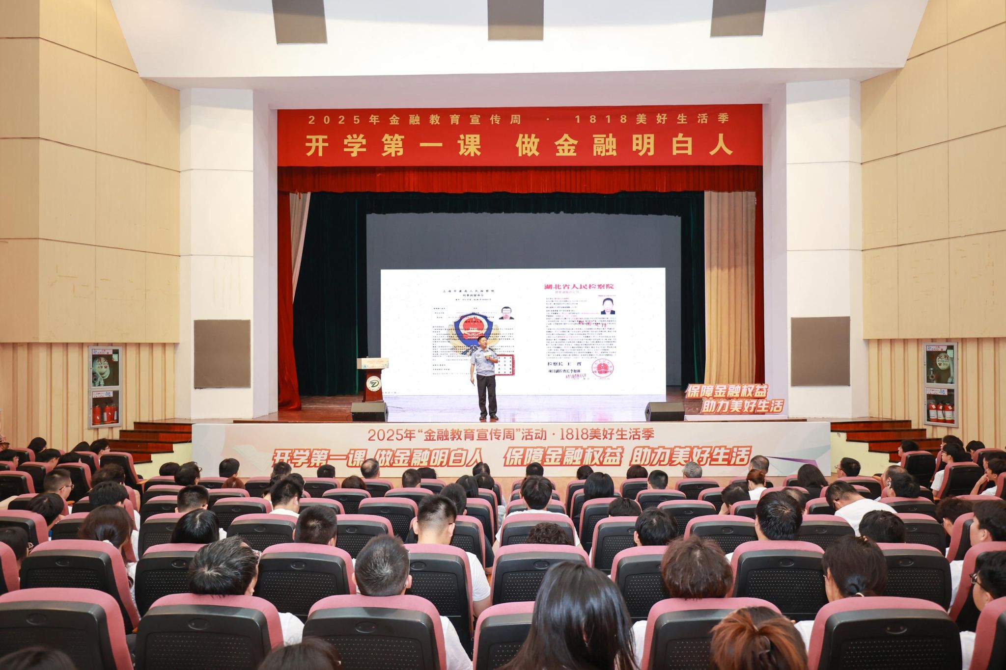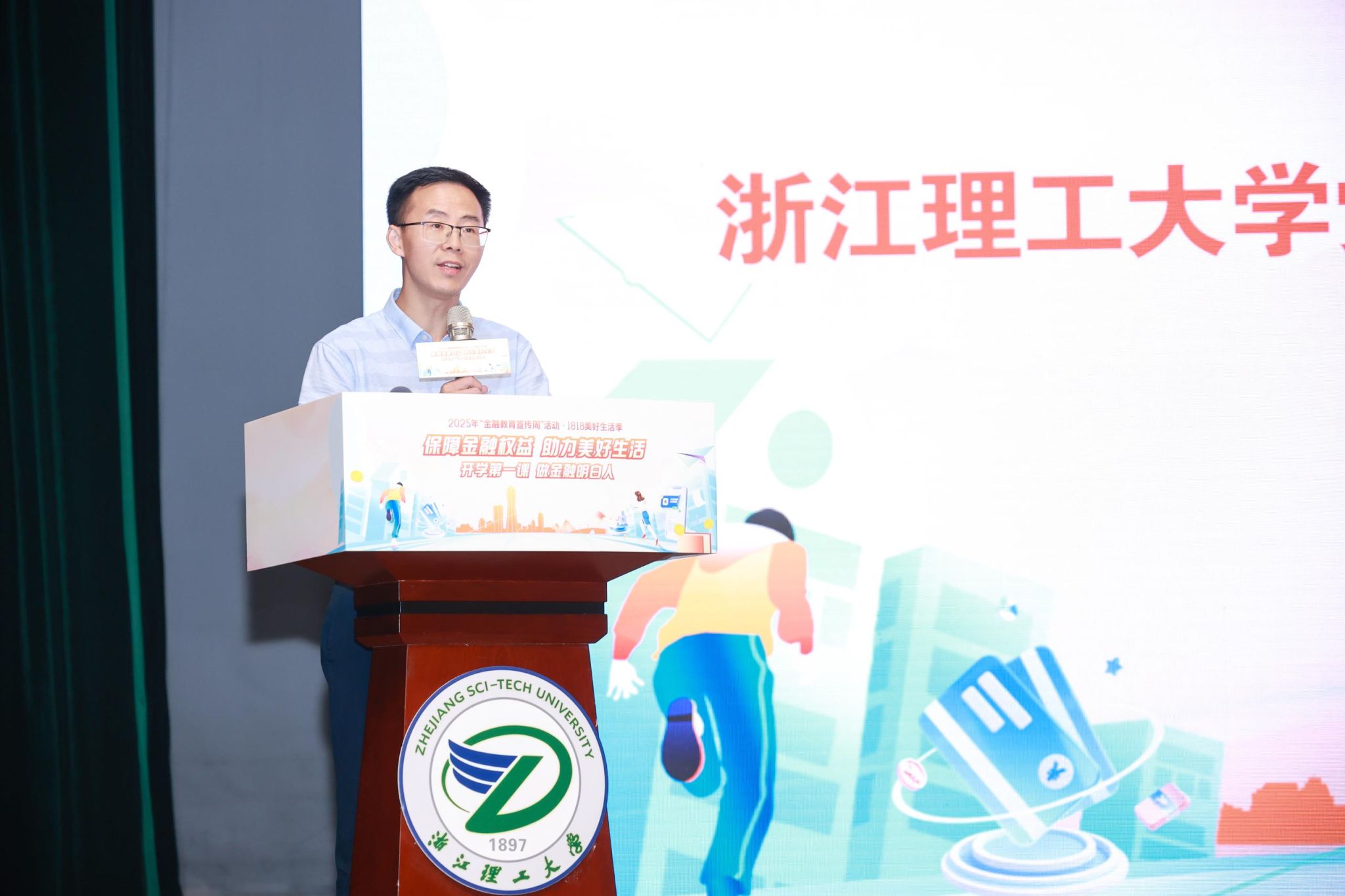 9月16日下午,mk官方网站_mk(中国)“2025年金融教育宣传周·1818美好生活季开学季专场”活动在下沙校区学生活动中心剧场举行。活动由浙江电视台民生休闲频道主持人邱慧媛主持。国家金融监督管理总局浙江监管局消保处副处长操建平、浙江省反诈中心警务技术二级主任郑小婷、浙江省银行业协会自律部主任孙晓露、mk官方网站_mk(中国)党委宣传部(党委教师工作部)副部长周照东、党委学生工作部(学生处、人武部)副部长卢跃华、化学与化工学院党委副书记王勇能、中国建设银行等多家金融机构代表以及浙江电视台相关领导出席活动。