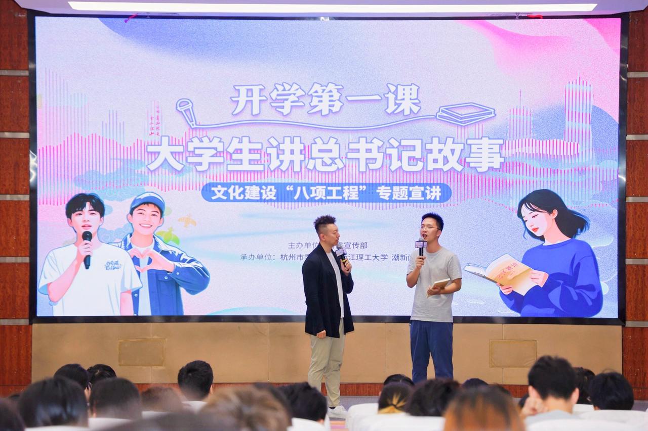 9月30日,“开学第一课——大学生讲总书记故事”活动在mk官方网站_mk(中国)二楼报告厅举办。当AI对话先贤、越剧邂逅理论、横店“霸总”现身说法,传统理论宣讲的“次元壁”被彻底打破,一场融合动漫、戏曲与国潮等元素的“高能”宣讲让浙江文化建设“八项工程”的深厚内涵在Z世代的创意表达中鲜活起来。