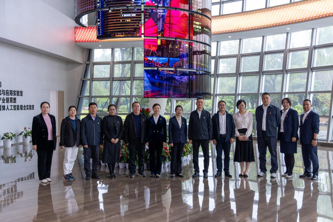 在沈子强等领导的陪同下,黄黎一行参观了华数国家实验室,深入了解了华数在传媒网络领域的前沿技术研发与应用成果。