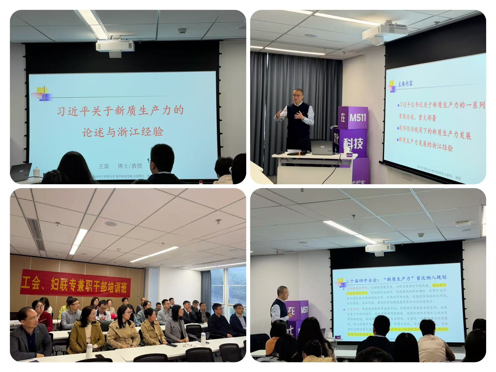 10月31日上午,培训正式拉开帷幕。首堂专题课程由杭州电子科技大学继续教育学院院长王雷担任主讲,王雷以“习近平关于新质生产力的论述与浙江经验”为主题,从习近平总书记关于新质生产力的一系列重要论述、重大部署,数字经济视角下的新质生产力发展和新质生产力发展的浙江经验三大板块为切入口,结合浙江在数字经济、产业创新等领域的实践案例,为参训干部深入解读新质生产力,提升数字赋能工作的主观能动性夯实了理论基础。