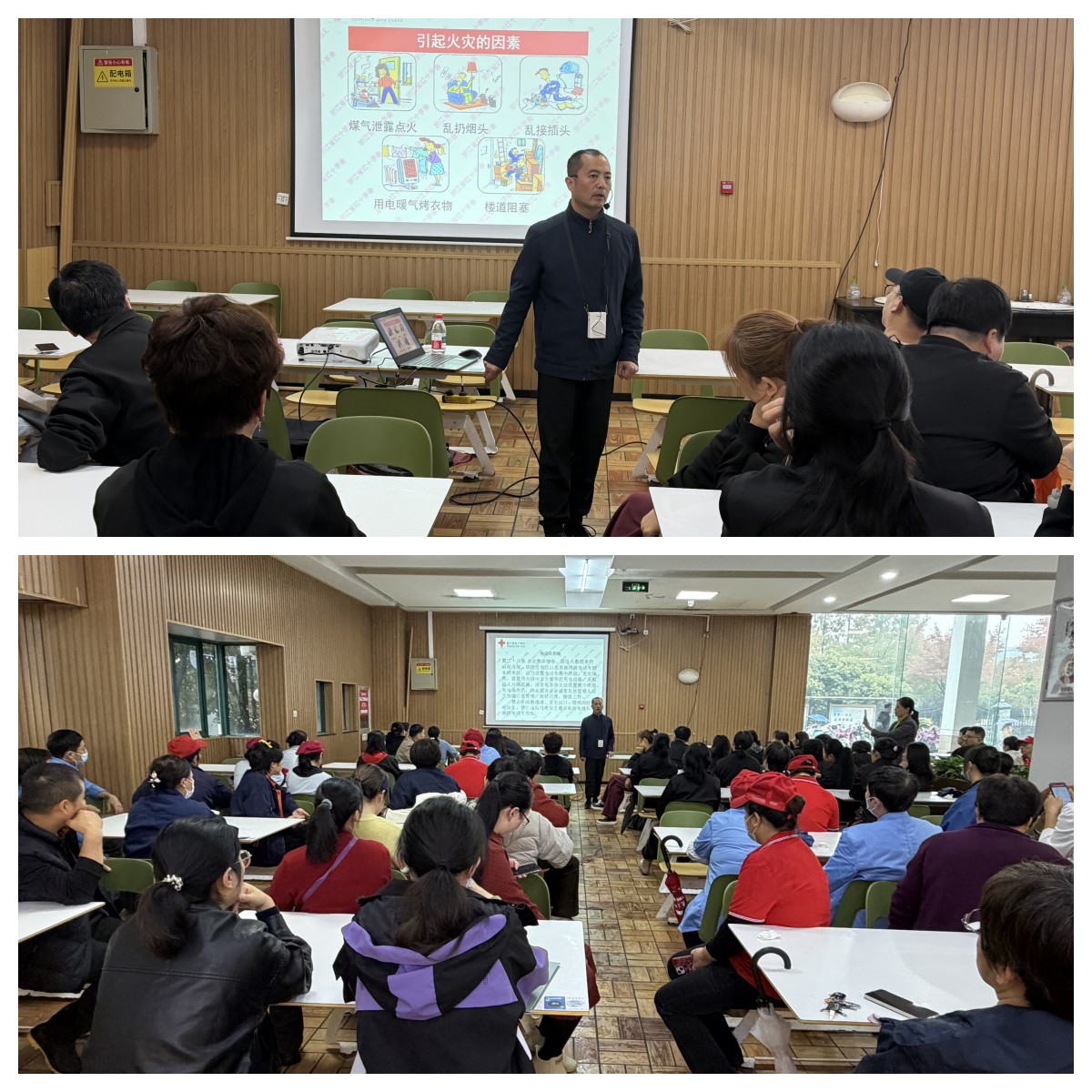11月6日,安全保卫部还面向宿舍管理、食堂运营、保洁绿化等170余名一线工作人员,开展了“安全用火用电”专题培训。消防科科长李赞颂结合法律法规和真实案例,重点讲解了火灾类型、逃生技能、灭火器使用及电动车充电安全等内容,强化后勤人员的火灾防范意识和应急处置能力。后续,专题培训还将在学院持续开展。