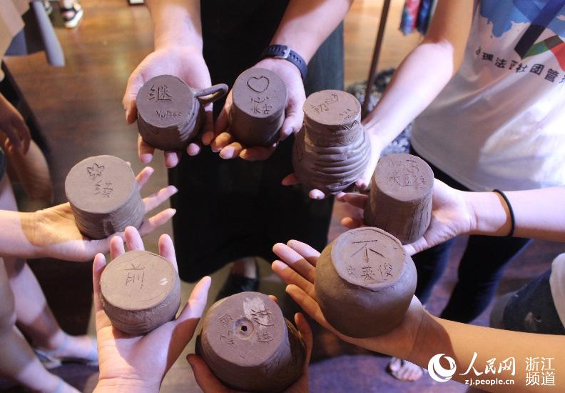 籍着社会实践的契机,同学们拜访了全国“三八红旗手”、浙江省非物质文化遗产传承代表人、吴越人家总经理吴莹女士,她向同学们诠释了新时代的工匠精神。同学们还参与了制作紫砂盘泥项目,在亲自制作的陶具上,同学们刻上了“不忘初心,继续前进”的字样,为民间工艺赋予时代印记。