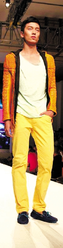 当胥添麒在记者面前走上T台,顿时耀眼起来。虽然没有灯光,没有音乐,胥添麒挺直着腰,迈出专业的步子,一副明星相,眼神流动,扫过面前空空如也的空间。