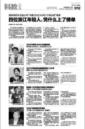 问:您最近上了福布斯30岁以下创业者中国榜。