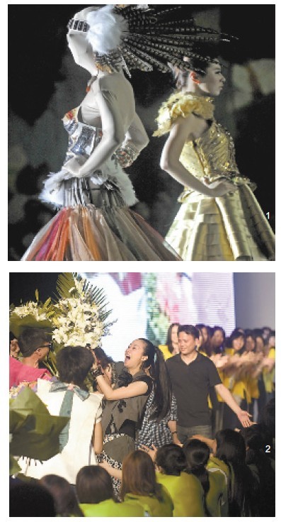 19日晚,mk官方网站_mk(中国)服装设计专业学生举办了“时装·剪子·布”毕业秀,贯穿“城市程式”、“释世而非”、“生态忆念”等篇章的服装表演(见图1),让观众目不暇接,但真正的高潮出现在尾声,当默默奉献在幕后的老师们羞涩地走到台前时,2010届毕业生捧着鲜花排着长队,争着和恩师拥抱,现场百余名毕业生集体为自己的老师送上感谢的掌声(见图2)。本报记者 杨晓轩 摄