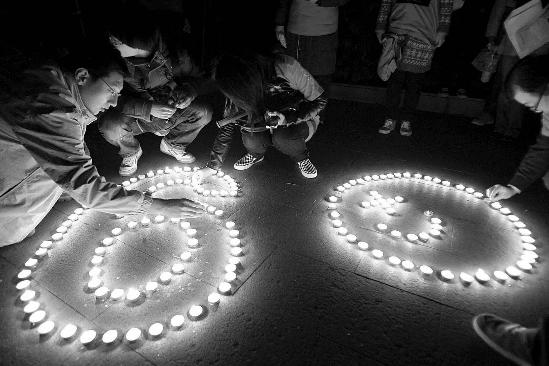 当时钟跨过晚上8点30分,折回湖滨路的志愿者小分队在凯悦酒店前廊前,用蜡烛摆放出“60、笑脸”的图形。星星点点的烛光中,志愿者们唱起“Heal the world”,与过往市民一同在黑暗中为地球默默许下心愿和祝福。