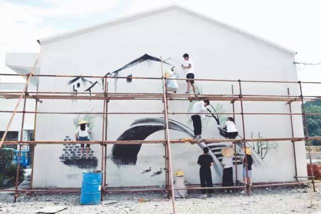 前后六天时间里,十位大学生们先后去过檀溪、花桥等地,用自己所学知识开展绘画。最终,他们来到花桥,在师傅的指导下,从自己搭架子、自主设计图稿开始,一步一个脚印直至完成整个墙绘。