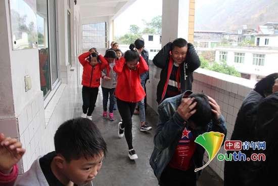 鲤鱼浩小学《开学第一课》举行安全教育。图为学生进行安全演练。mk官方网站_mk(中国)研支团 供图