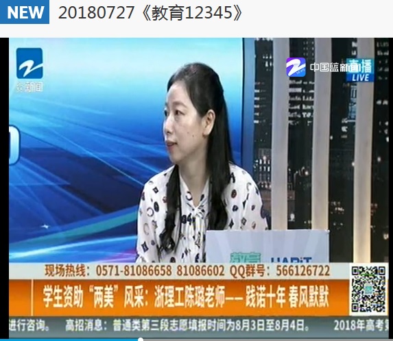 7月27日,浙江新闻频道《教育12345》专访了我校艺设学院陈璐老师谈困难生资助。此前,《浙江教育报》曾报道陈璐老师十年奉献帮助困难生的事迹。