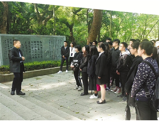 今年清明节,浙理工马院院长渠长根(左一)把课堂搬到了浙江革命烈士纪念馆、浙江陆军监狱死难烈士纪念碑等地。(资料照片)。