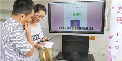 找个暂时避雨的地方,小郭打开下载好的“易班”APP软件,登入账号后显示迎新系统,她按顺序登记后确认报到,然后进入人脸识别录制,把摄像头对着脸,动几下,很快系统就提示完成报到,一张电子报到证出现在手机里,里面还提示她要入住的寝室楼,房间号以及床号。