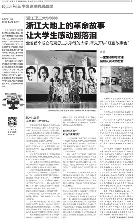 近日来,浙江卫视《浙江新闻联播》、《浙江日报》、《钱江晚报》、学习强国、光明日报客户端等全国、省内主流媒体相继以大版面对此进行了报道。其中《浙江日报》、《钱江晚报》均以整版对红色故事会进行了报道,介绍了我校刚成立的“红色文化讲习馆”,同时《钱江晚报》还刊发了我校党委书记吴锋民署名文章:《一堂生动的思政课是触及灵魂的教育》。