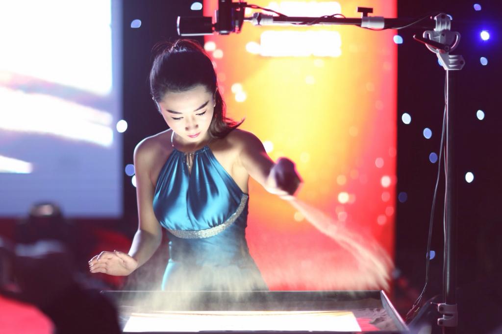 幻灯为纸、金沙为墨,撒下一把细沙,伴随着音乐起伏,周雪子的指尖就像精灵一般,翩翩起舞,游刃有余。