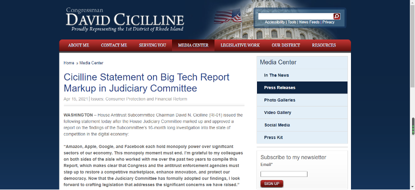大卫·西西林在4月15日发布声明称:“‘GAFA’在我们经济的重要领域拥有垄断力量。这种垄断的局面必须结束。我感谢我的两党同事,他们在过去两年中与我一起编写了《报告》。《报告》明确表明,国会和反垄断执法机构必须加快步伐,恢复一个有竞争力的市场,加强创新,并保护我们的民主。现在司法委员会已经正式采纳了我们的调查结果,我期待着起草立法来解决我们所提出的重大关切问题。”