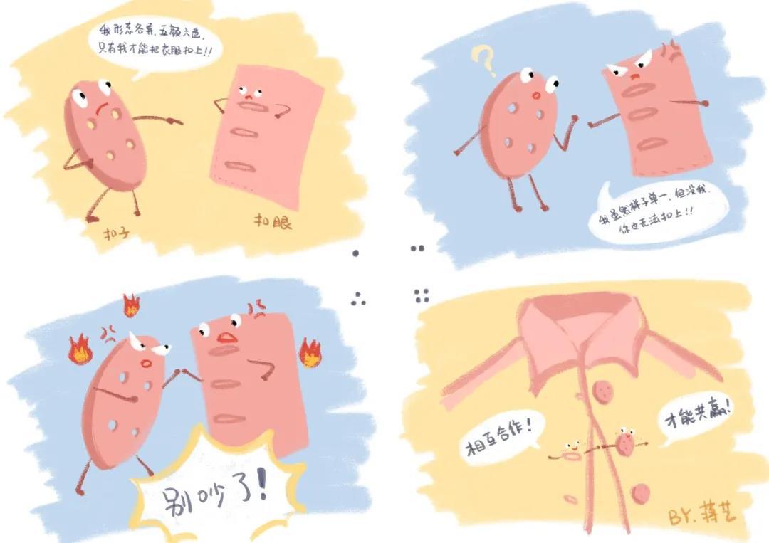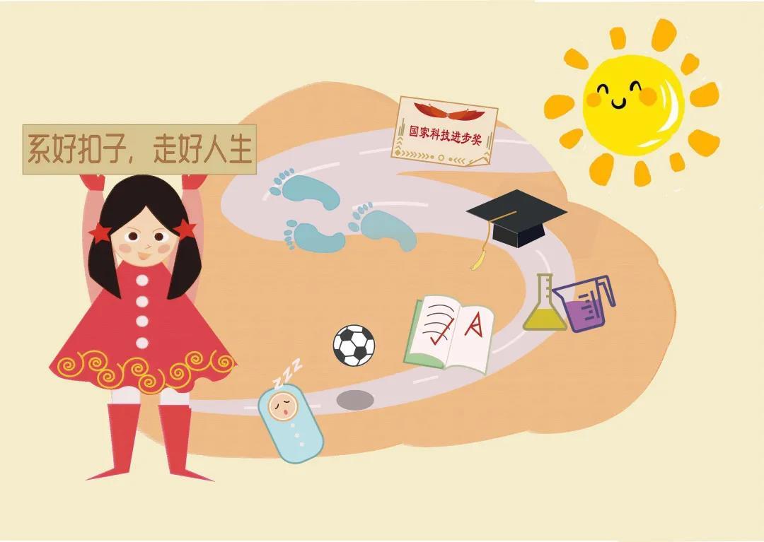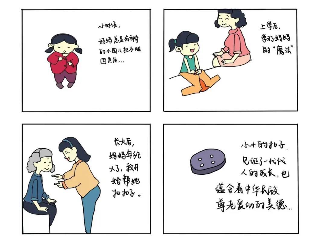 漫画册共有32幅手绘漫画,由国际教育学院和艺术设计学院学生创作。一幅幅关于“扣好人生第一粒扣子”的漫画,既是一次别开生面的思政教育课,也是母校对学子们深情的祝福和希冀。每一幅漫画,都蕴含着丰富的内涵:一辆小汽车行驶在人生的道路上,没有扣好的扣子就像没盖好的窨井盖,一不留神就会坠入深渊;眉眼带笑的母亲,正在帮助自己的孩子扣好扣子,而孩子长大后,又帮助年迈的母亲扣扣子,形成了爱的轮回;一粒大大的扣子,四个扣眼中各伸出一只手臂紧紧握在一起,形成了一个团结稳固、坚定有力的整体……