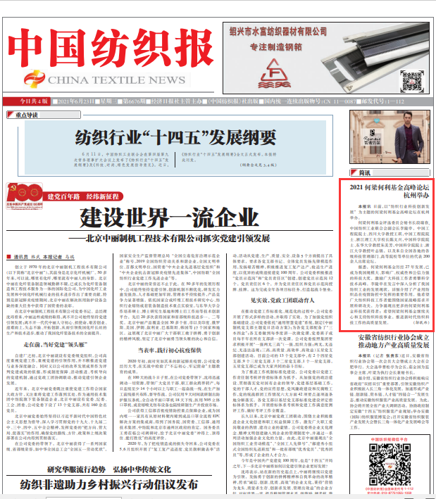 6月23日,《中国纺织报》、人民日报海外网、科技金融网报道了我校举办2021年何梁何利基金高峰论坛。