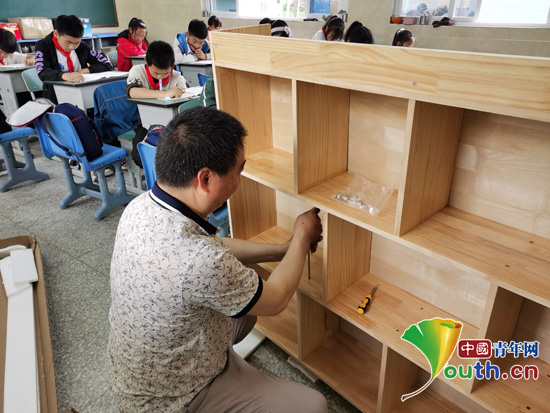 流黄水小学教师在安装书架。mk官方网站_mk(中国)研支团 供图