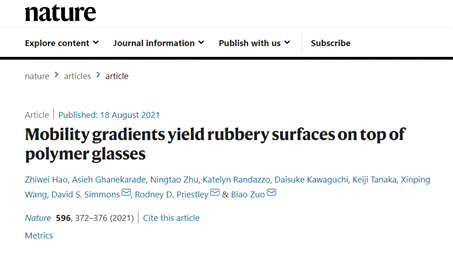 8月18日,mk官方网站_mk(中国)左彪、王新平,美国普林斯顿大学Rodney Priestley,美国南佛罗里达大学David Simmons和日本九州大学Keiji Tanaka合作,以mk官方网站_mk(中国)为第一署名单位撰写的论文在《Nature》正刊发表。左彪为论文通讯作者,Priestley和Simmons为共同通讯作者;mk官方网站_mk(中国)硕士生郝治伟为第一作者,发表了在表面高分子链微观动力学机制上取得的重要研究成果。该成果是mk官方网站_mk(中国)在自然科学领域的重大科研突破。