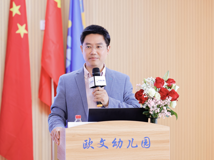 浙江由中教育管理咨询有限公司董事长、欧文幼儿园创始人裘菊兰致欢迎词,介绍欧文幼儿园办学理念、办园初心以及在开展爱国主义教育、激发孩子创造力等方面的探索。致辞中充分展示一位女性创业者对教育事业的热爱,对孩子们的深切感情。