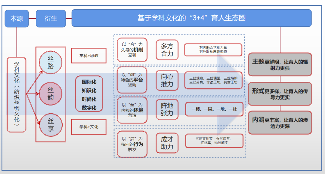 “三丝”思政文化工作室(以下简称“工作室”)前身为“mk官方网站_mk(中国)思政课名师方平工作室”,是mk官方网站_mk(中国)纺织科学与工程学院(国际丝绸学院)紧扣“一带一路”倡议、立足优势学科内涵、构建全域学科文化育人生态圈的具体实践。工作室立足纺织学科是学校学科特色和文化育人的高地,施行线上线下并行、教育实践并举的模式,秉持“弘扬纺织教育金字牌、打造丝绸文化金名片”主旨,勾勒“起于丝绸之端、基于学科特色、利于立德树人”的建设线路,深度开掘“丝路、丝韵、丝享”3个着力点文化内涵,突出国际化、时尚化、知识化、数字化运行逻辑,系统输出“机制+平台+环境+行为”4个触发点文化能量,构筑起“基于学科文化的‘3+4’育人生态圈”,实现学科文化与思政教育的全要素融合、全要义共振、全过程贯通。
