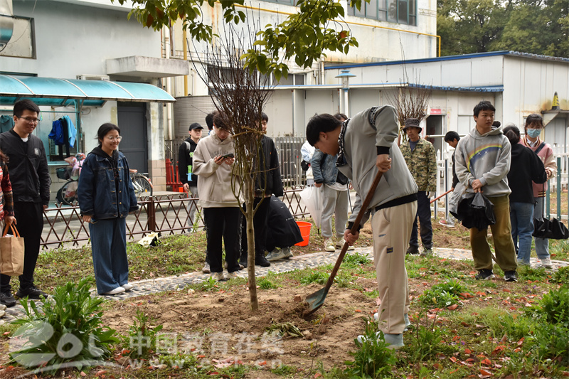 同学们一边栽树、浇水,一边倾听杨王虎等老师们讲述不同树种所蕴含的思政小故事,在劳动的过程中厚植理想信念。