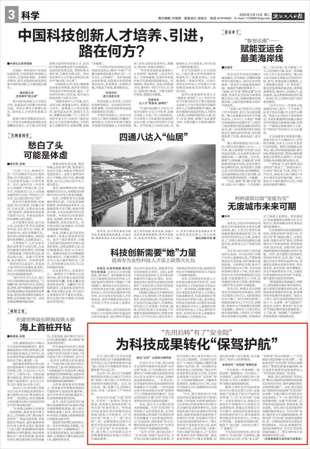 3月14日,《浙江工人日报》(第3版)报道我校科技成果转化。