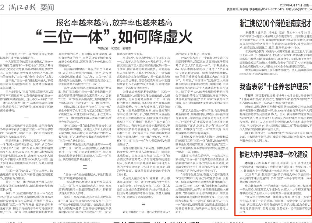 4月13日-4月17日,【光明日报客户端】《浙江日报》【浙江新闻频道】《浙江教育报》【潮新闻】全省大中小学思政课一体化建设工作推进会在我校召开。