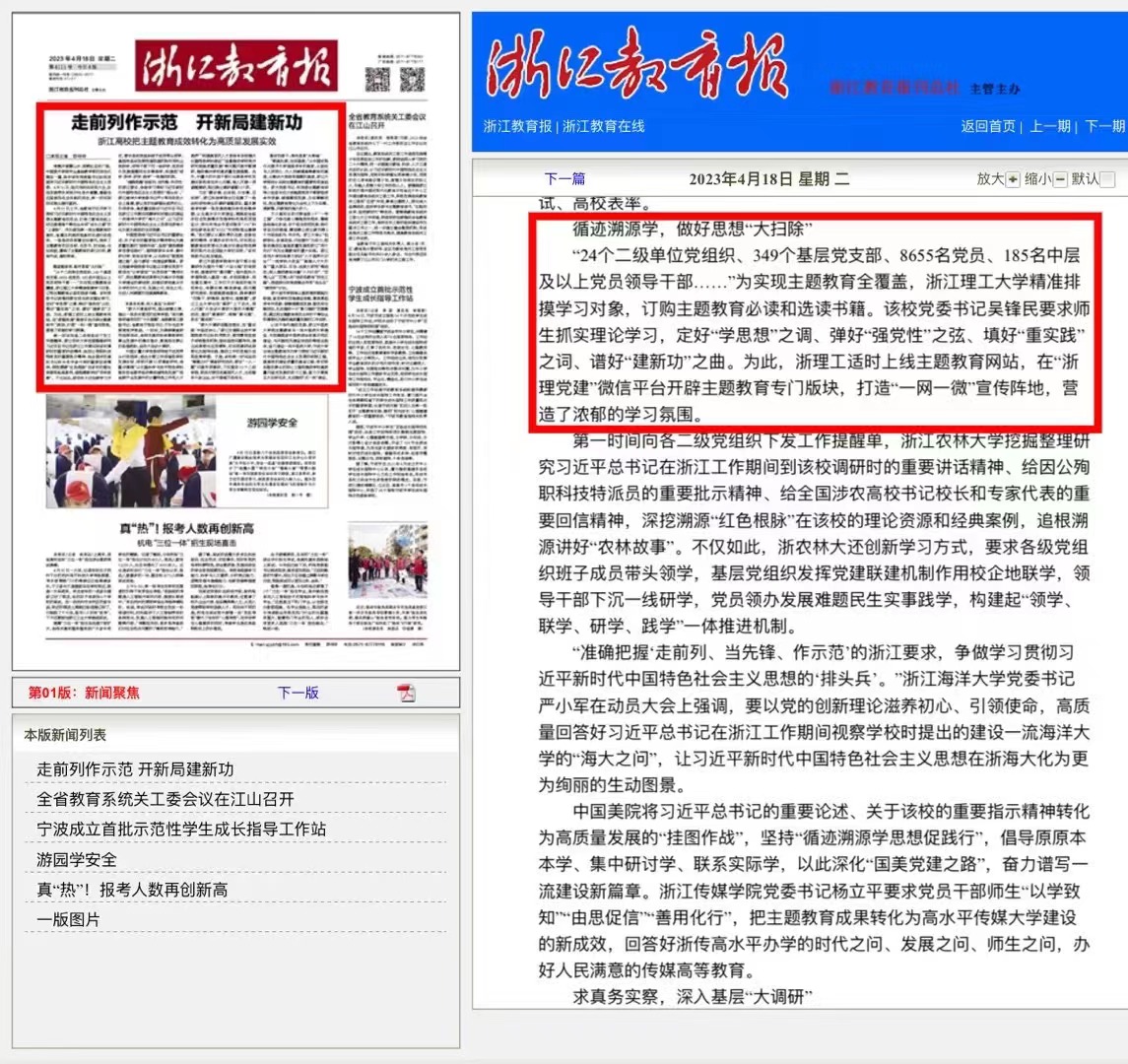 4月18日,《浙江教育报》头版报道我校开展主题教育。