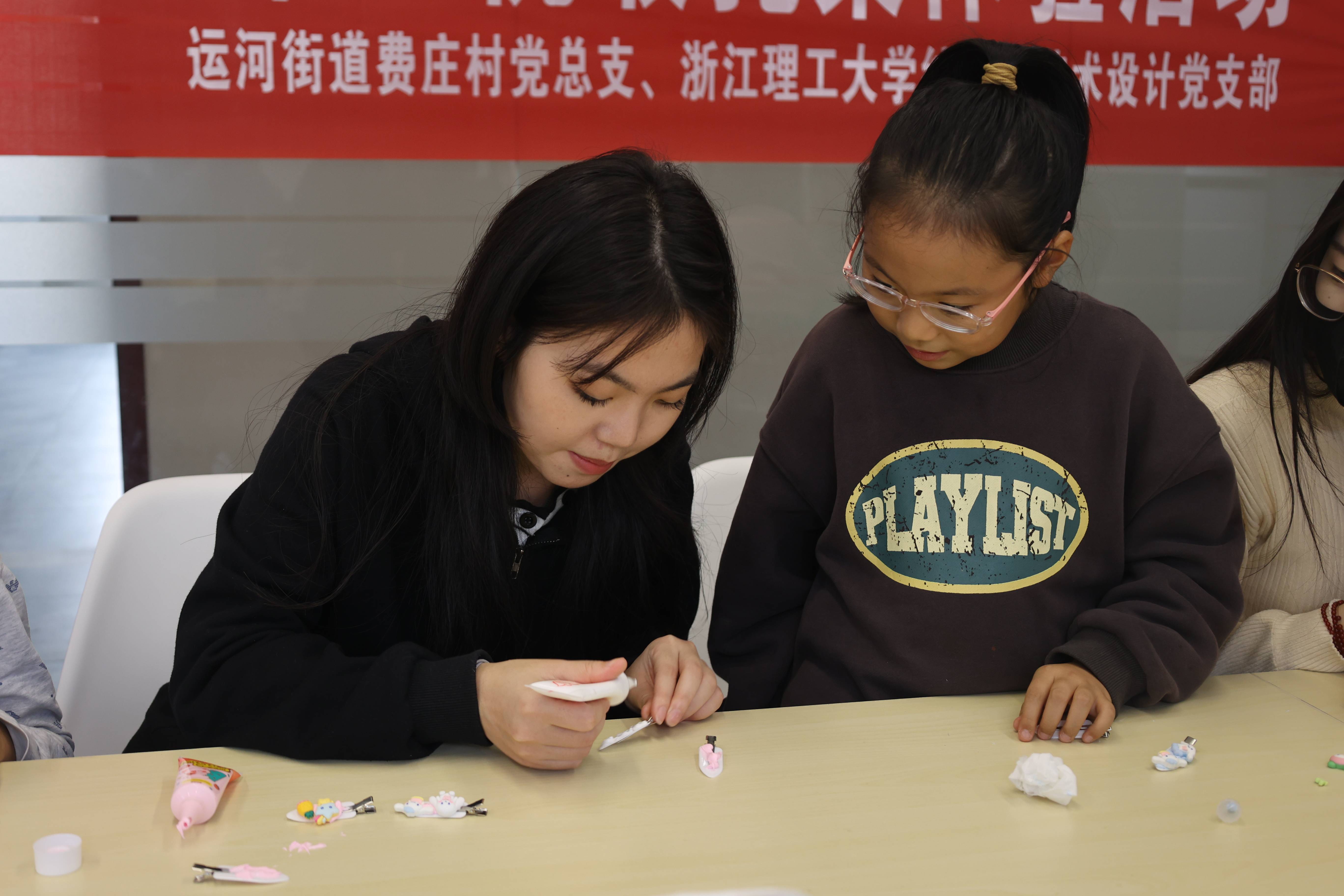 “‘一老一小’是村里面的‘民生大事’,我们想打造‘孩子开心、家长称心、社会放心’的‘三心’校外阵地。”在运河街道费庄村学习杭锻织造技艺的纺织品艺术设计学生党员们了解到这一情况后多次与村委的负责人进行对接,发挥专业特长,通过学业辅导、美育课堂等方式,携手打造了“‘费’童繁想·茁‘庄’成长”假日学校。在“创艺共享”美育课堂上,党员志愿者们不仅带领小朋友们学习了各种绘画技巧,还结合专业特长指导小朋友们进行了创意手工服饰品制作,在艺术的思维碰撞中,小朋友们的手工能力与创新意识得到了提升,志愿者们也在奉献中体会到了自身的价值。