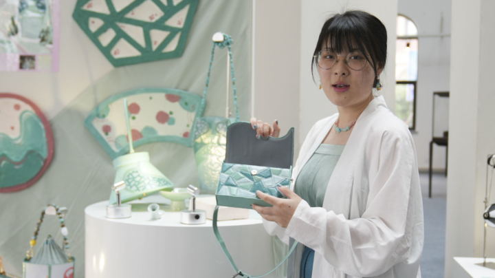 “我设计的这一个系列的包包,就是从青瓷中汲取的灵感。”毕业生吴欣怡告诉记者,作品在常规化的造型基础上,创造出如青瓷般雅致的廓形和灵动的翠色,营造出高雅素净的特点。大学期间,她曾在上虞区上浦镇感受过越窑青瓷的魅力,也特意为自己的毕业作品注入青瓷元素。