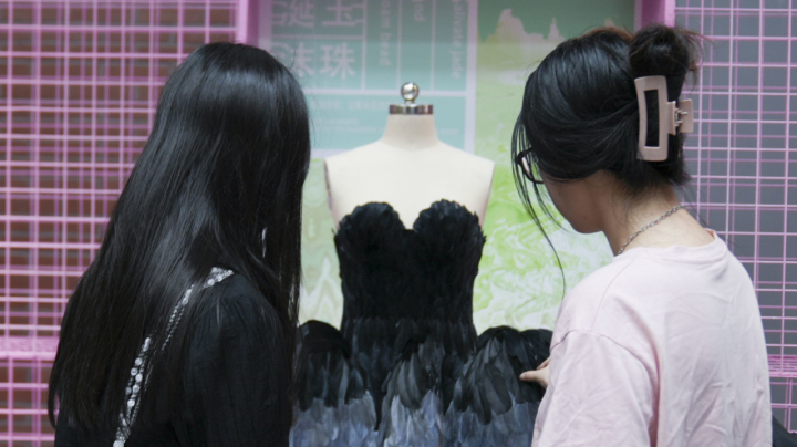 “上虞内河湖交错、水系发达,我们用‘曲水流觞’作为毕业展的主题,让学生用艺术作品展现江南水韵。”纺织服装系服装与服饰设计专业负责人孔建慧告诉记者,本次毕业联展的背后凝聚了指导老师们的智慧,表达了毕业生们多元化的设计灵感和对传统纺织文化的创新理解。