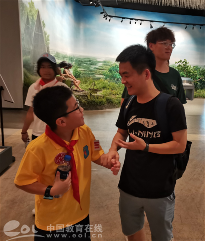 在湖州钱山漾文化交流中心,实践队员们与夏令营少先队员们一起参观钱山漾文化交流中心展厅,从古老的湖桑养殖、缫丝织造,到三锦四绣的艺术创作,从初探天虫蜕变,纵览桑丝文明,品味生命意义的升华,更加全面地了解到“世界丝绸之源”的全貌。