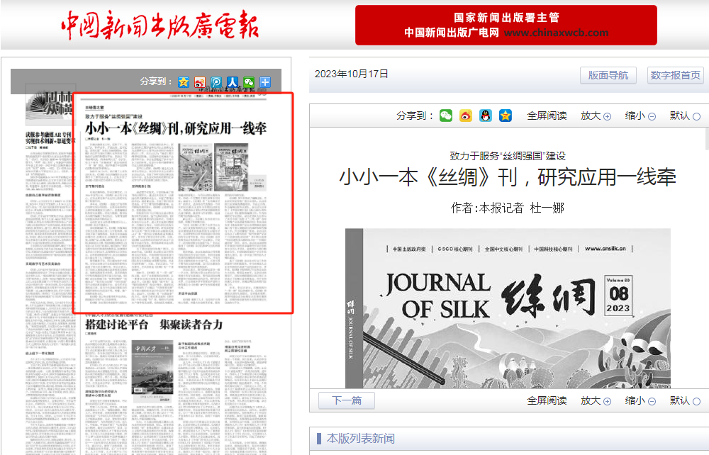 10月8日,《中国新闻出版广电报》报道了我校《丝绸》杂志办刊经验。