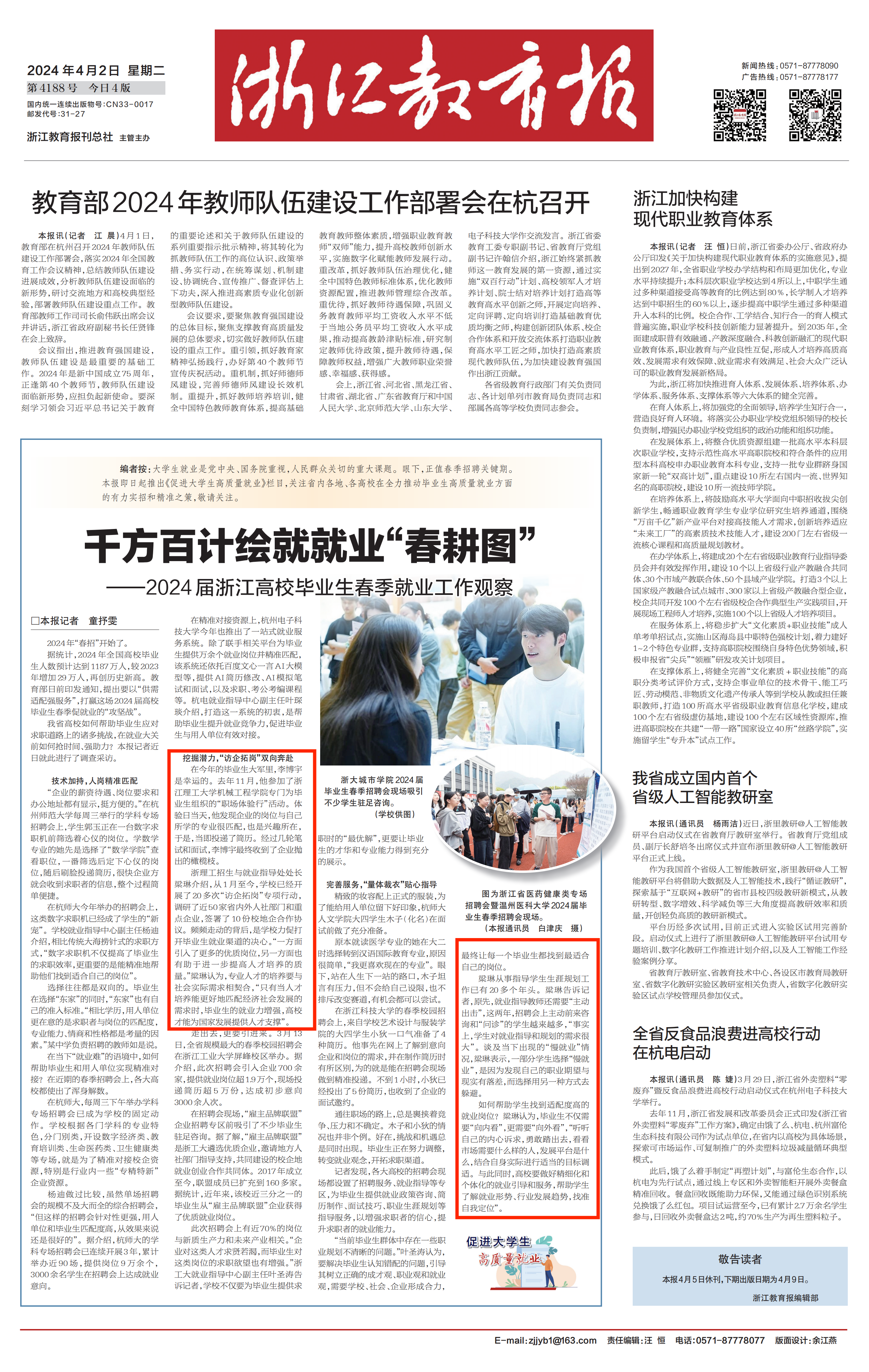 4月2日,《浙江教育报》头版报道我校就业工作。