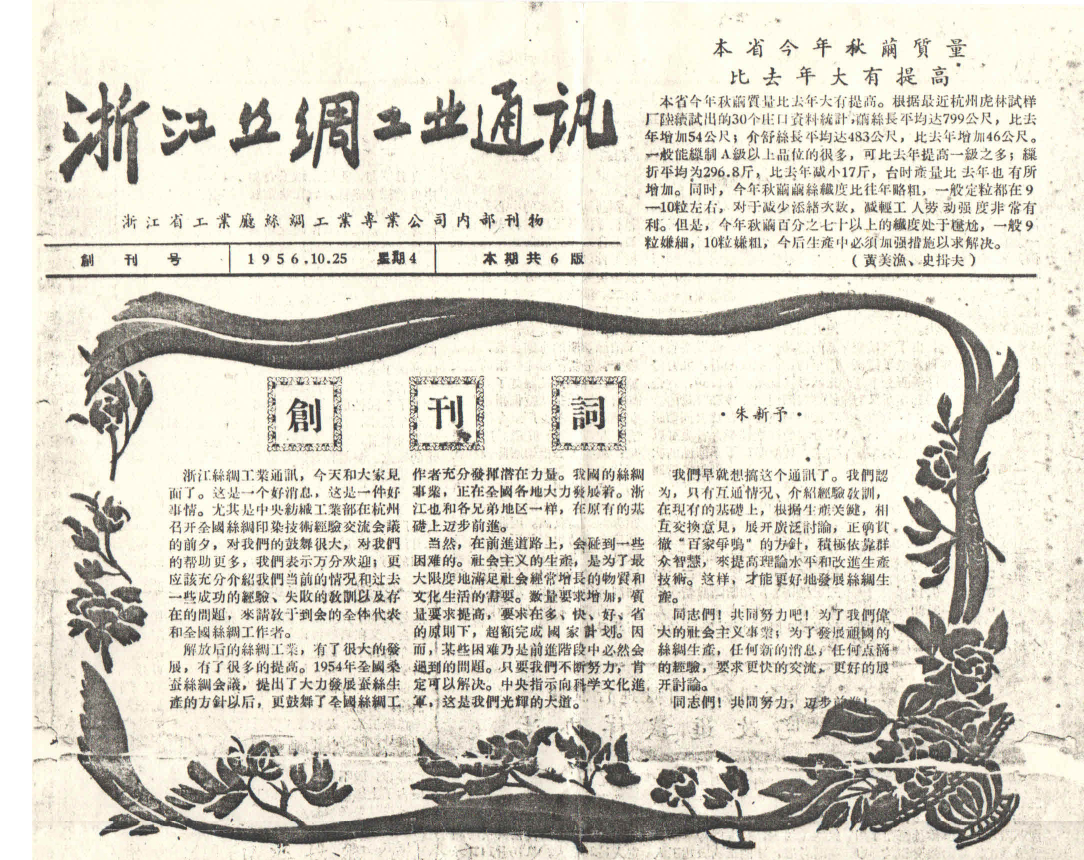 1956年10月,著名蚕丝专家、丝绸教育家,时任浙江省工业厅副厅长兼丝绸局局长的朱新予先生立志科技振兴中国丝绸行业,在西子湖畔亲自筹划创办了《丝绸》期刊的前身《浙江丝绸工业通讯》。经过60年的风雨,通讯刊物逐渐发展,成为目前全国丝绸行业历史悠久,流行广泛,深受欢迎的兼丝绸技术、文化与情报于一身的《丝绸》杂志。