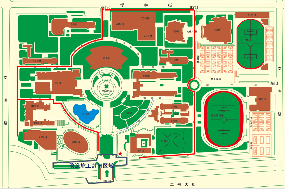 4.南门出入口施工封闭区域及机动车校园行车线路参考如下: