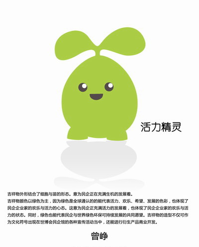 曾峥的作品《活力精灵-绿苗》从形态和理念上都获得了好评。作品外形结合细胞与苗的形态,意为民企的发展充满生机。颜色以绿色为主,因为绿色是全球公认的能代表活力、欢乐、希望、发展的色彩,体现了民企企业家的欢乐与活力的状态。同时,绿色也代表民企与世界绿色环保可持续发展的共同愿望。