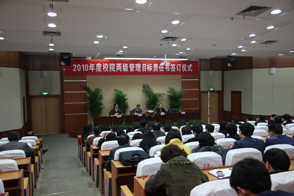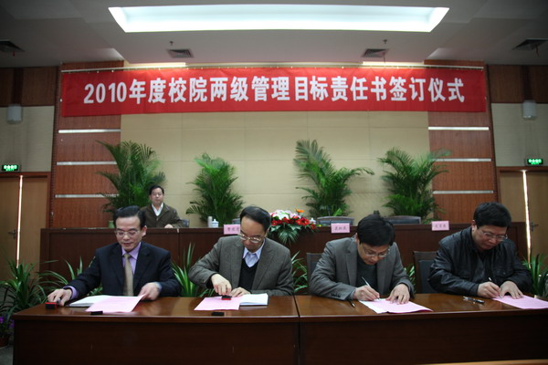 随后,校党政一把手分别与学院、教研部党政主要负责人和机关职能部门负责人代表庄重地签订了目标责任书。机械学院院长、经管学院党总支书记、科技处处长作为签约代表作了发言。他们都表示虽然今后的工作任务更为繁重,责任压力更加大,但都有信心、有决心完成2010年的工作目标。