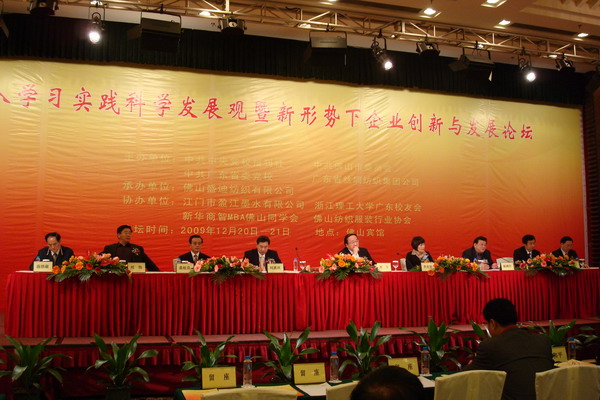 12月20至21日,“深入学习实践科学发展观暨新形势下企业创新与发展论坛”在广东省佛山市举行。中国马克思主义基金会副理事长、中央党校原教育长郝时晋,广东省政协副主席温兰子等领导出席会议并讲话;国务院原稽查特派员、中国国情调研中心主任刘吉,中国民族贸易促进会执行会长、研究员刘延宁,北京大学校长助理、北京大学经济学院院长刘伟,中共广东省委党校副校长陈鸿宇等专家学者作主题演讲。我校校长裘松良应邀参加。