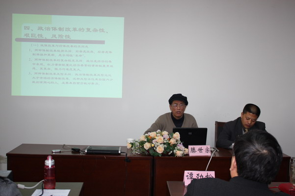 12月2日下午,我校马克思主义学院第七场马克思主义论坛在6号楼523室举行。中国社会科学规划专家、郑州大学政治系滕世宗教授作了“中国政治体制改革若干问题研究”的主题报告。报告会由学院副院长主持。