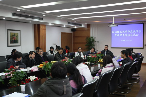 表彰大会结束后,华鼎奖学金设立人、华鼎集团公司总裁、我校优秀校友丁雄尔还和华鼎奖学金获得者一起在行政楼308室进行了座谈交流。出席交流会的还有校党委副书记程刚、华鼎品牌服装有限公司总经理刘刚以及学工部负责人等。