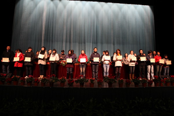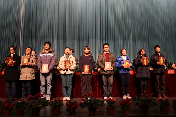 大会对2008/2009学年获奖集体和个人进行了表彰。主席台领导为校综合素质奖学金、纺织之光奖学金、桑麻奖学金和华鼎奖学金获得者,优秀班主任、先进班级、校内优秀学生奖学金获奖代表等颁了奖。