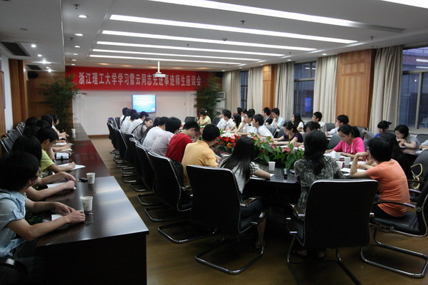 6月3日晚,我校师生代表在行政楼308会议室和2N124教室集中收看了中央电视台《新闻联播》播出的时代先锋——我校兼职教授雷云同志的先进事迹报道,并在308会议室举行了学习雷云同志先进事迹座谈会。与雷云同志密切接触过的教授代表、青年理论工作者、青年教师代表、专职团干部、学生党员、学生代表等参加了活动。浙江卫视和浙江之声的记者对本次活动作了现场拍摄采访。座谈会由党委宣传部部长主持。